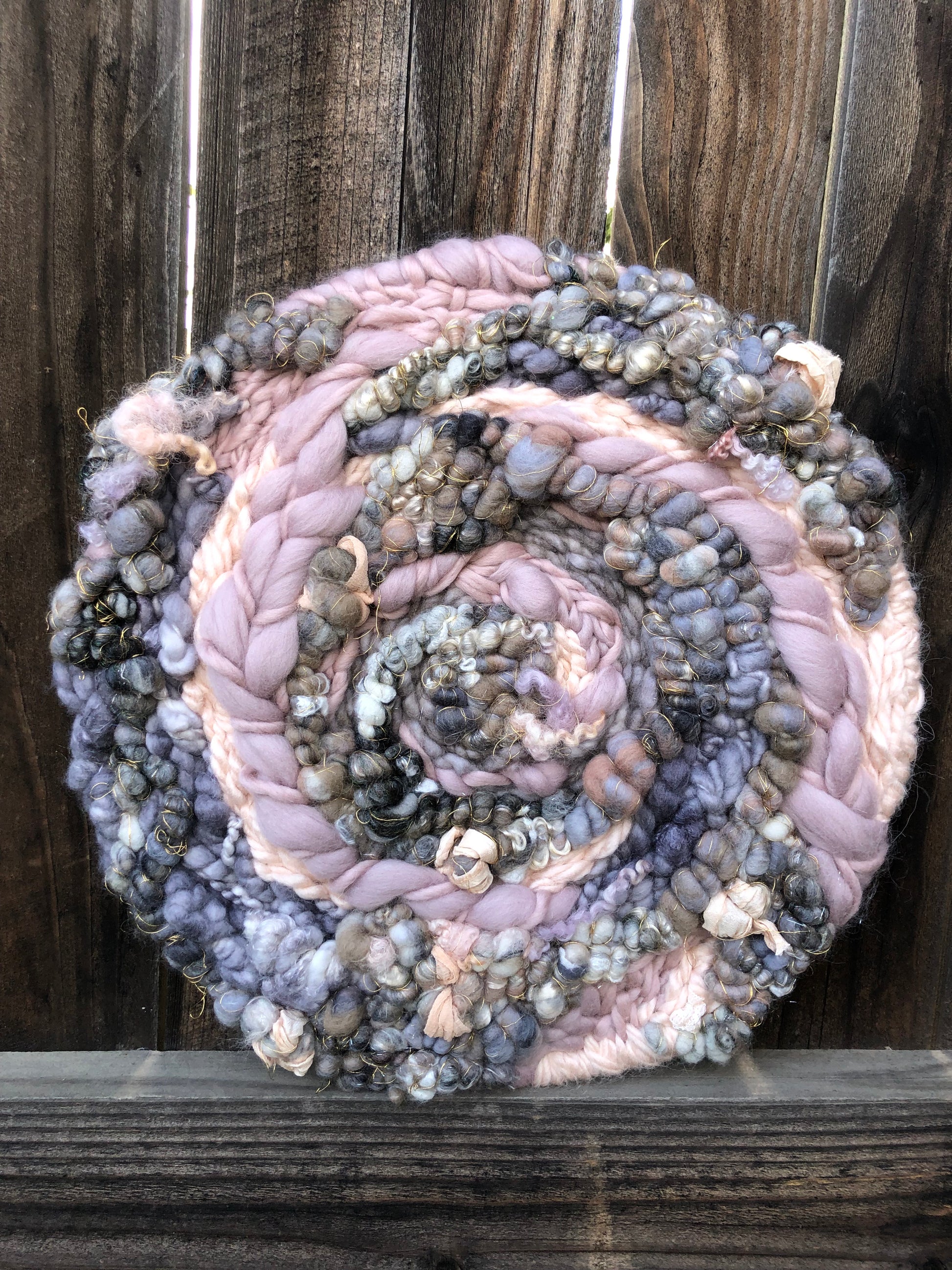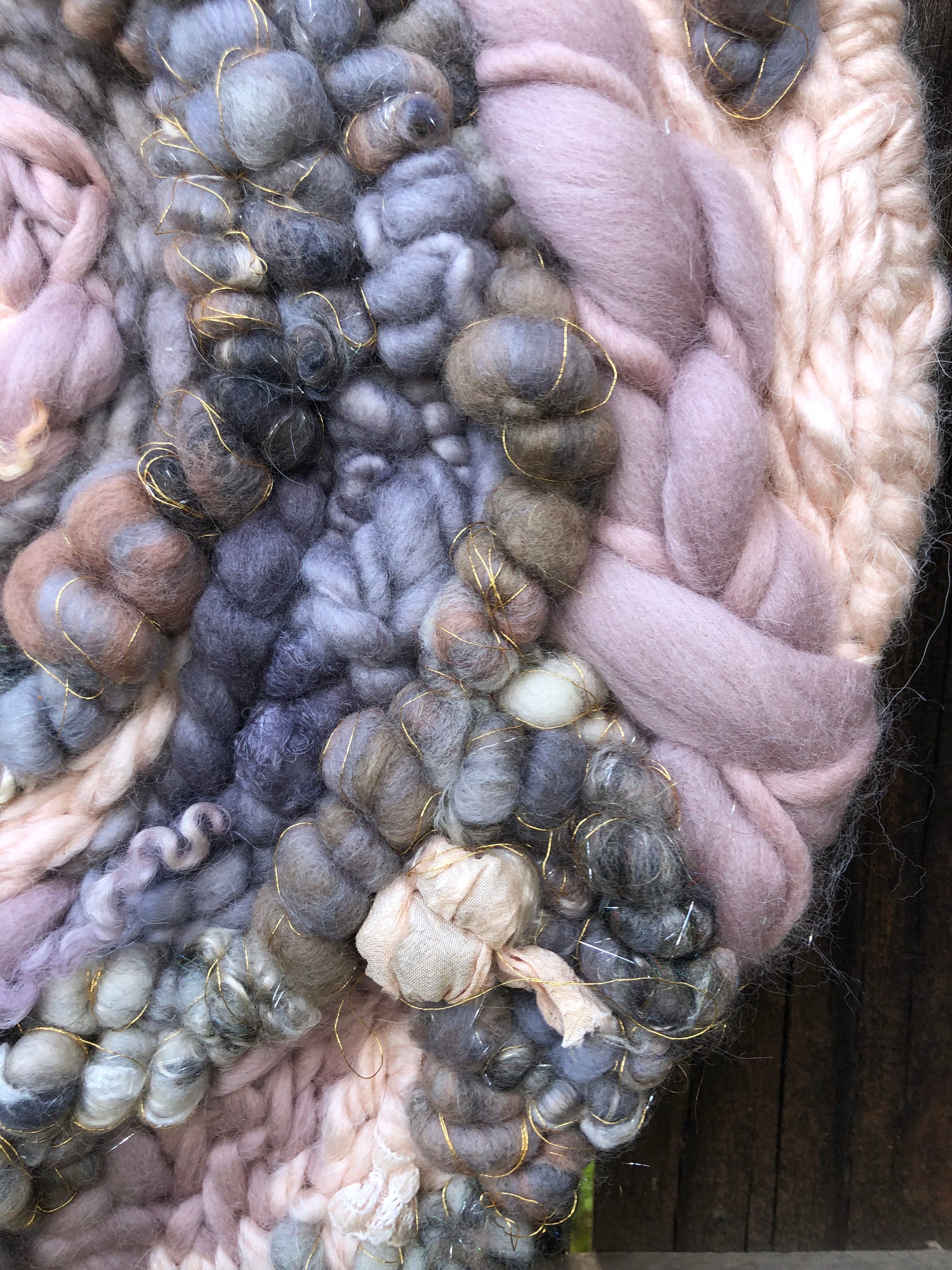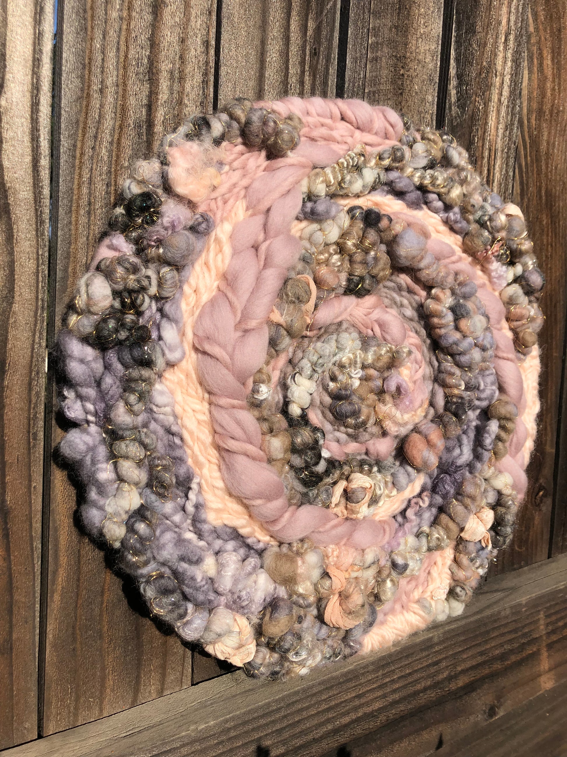 Early spring thunderstorms inspired this muted wall hanging. Soft pinks and purples are surrounded by clouds of grey. The subtle hints of sparkle add a gentle feminine feel.